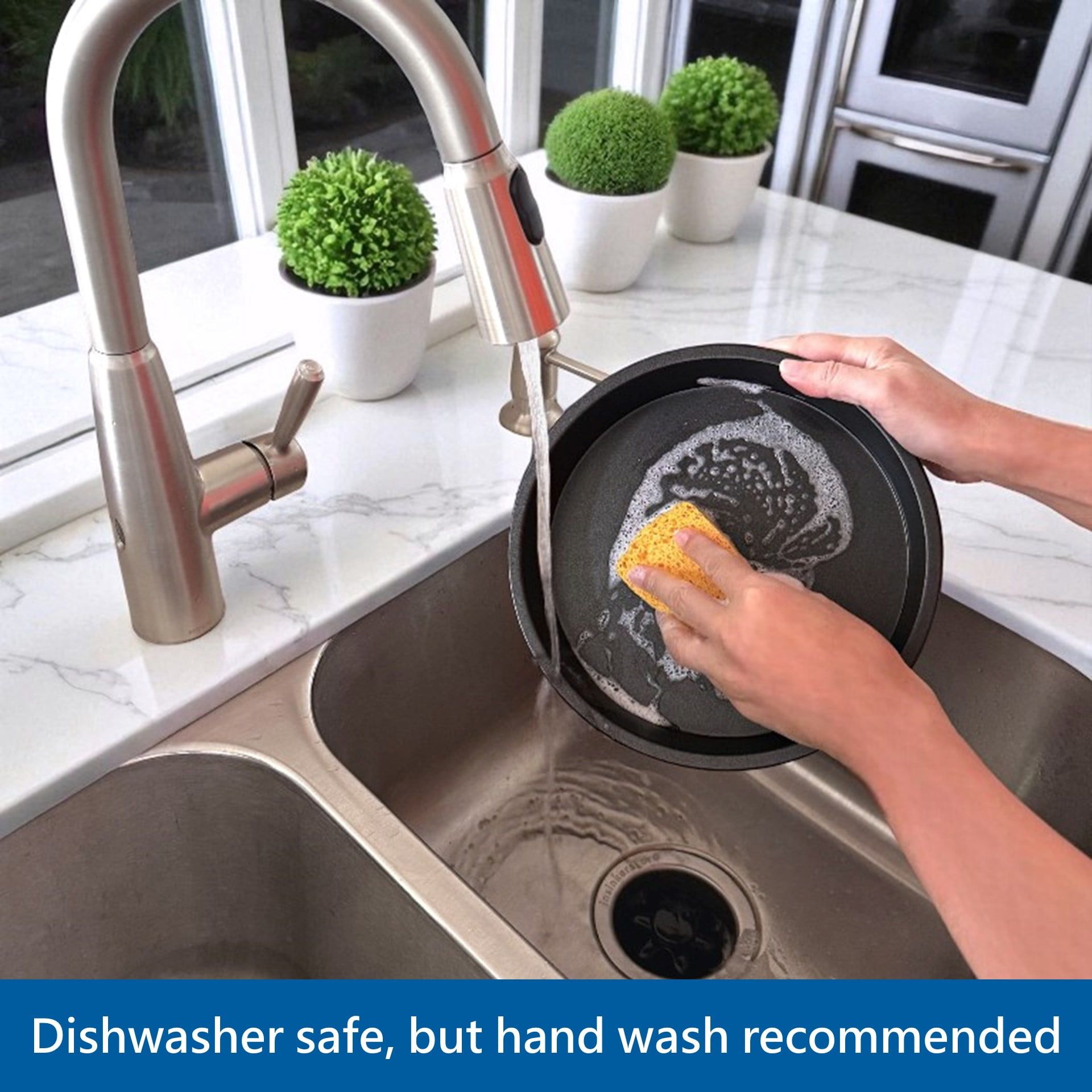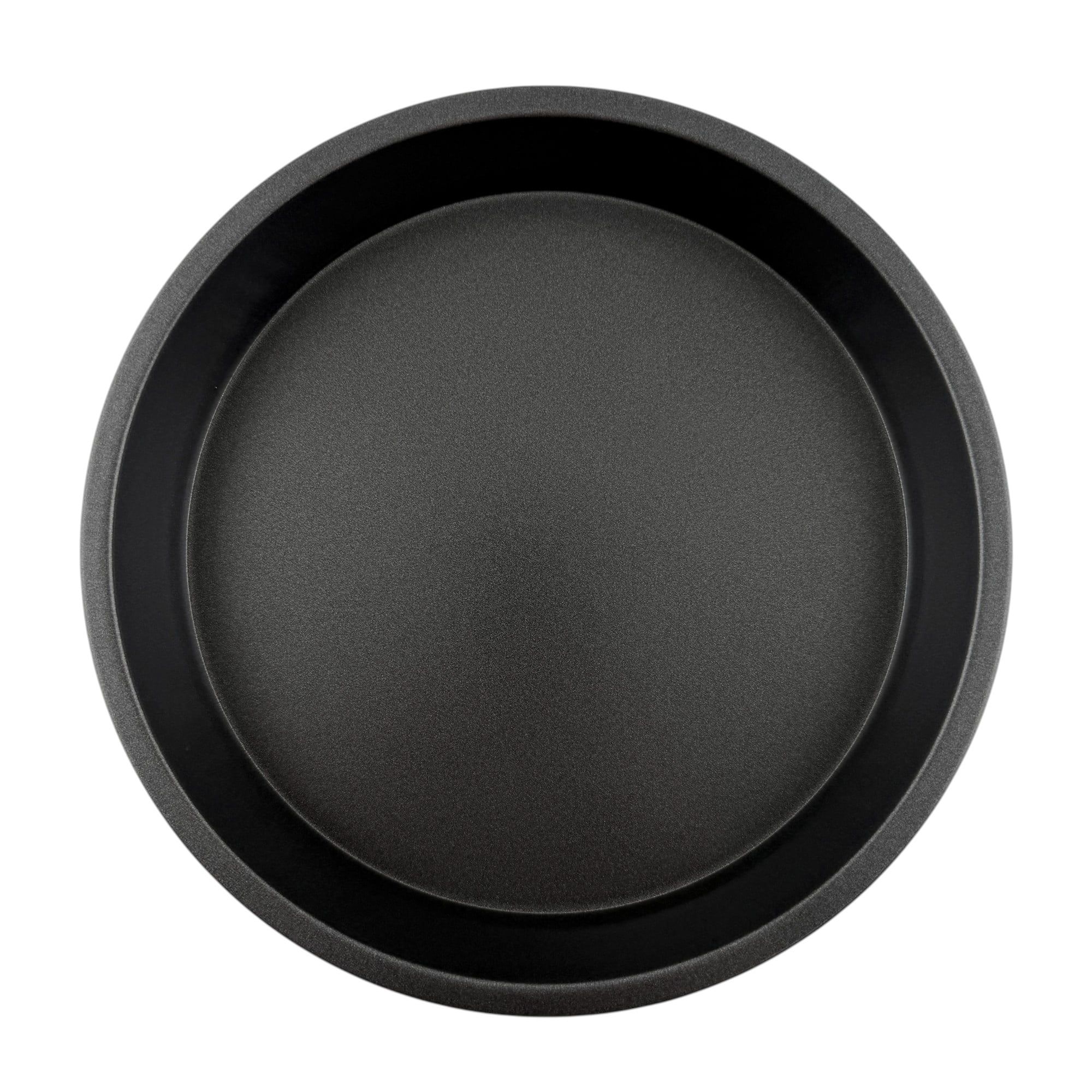 mpress your family and friends with bakery-worthy cakes in this Nonstick Steel 9" Round Cake Pan. The Round Cake Pan features a dark, durable nonstick finish allowing for even heat absorption that ensures a golden-brown result with every use. Crafted from quality nonstick steel, the Nonstick Round Cake Pan is multi-functional, not only great for cakes, but ideal for making savory deep-dish pizza, breads, cakes and more! The Nonstick Round Cake Pan is coated with a durable nonstick finish which allows for quick release of food and easy cleanup. For best results hand wash in warm, soapy water and dry thoroughly after each use. Dimensions are 9" (22.86 cm) in diameter x 1.5" (3.8 cm).