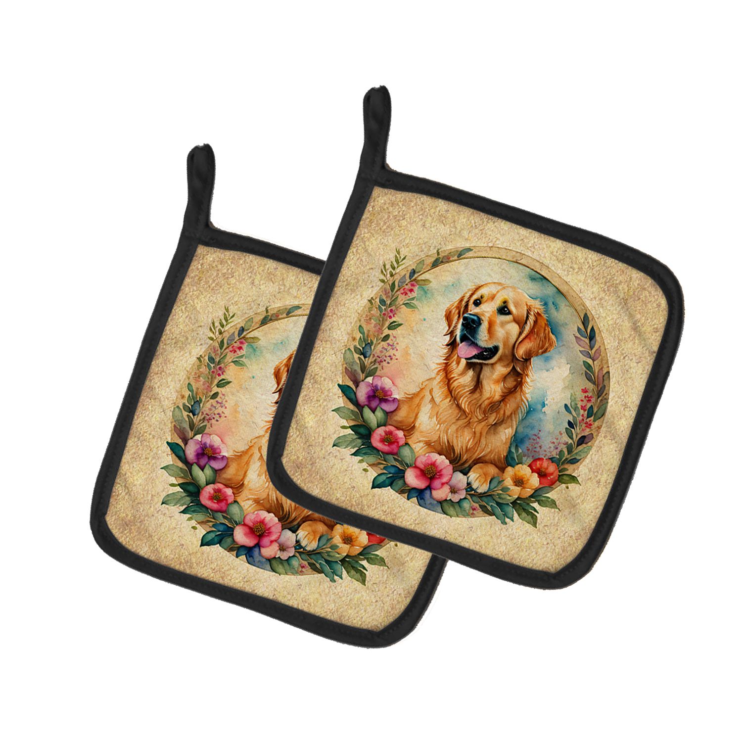 Golden Retriever and Flowers Pair of Pot Holders Kitchen Heat Resistant Pot Holders Sets Oven Hot Pads for Cooking Baking BBQ, 7 1/2 x 7 1/2