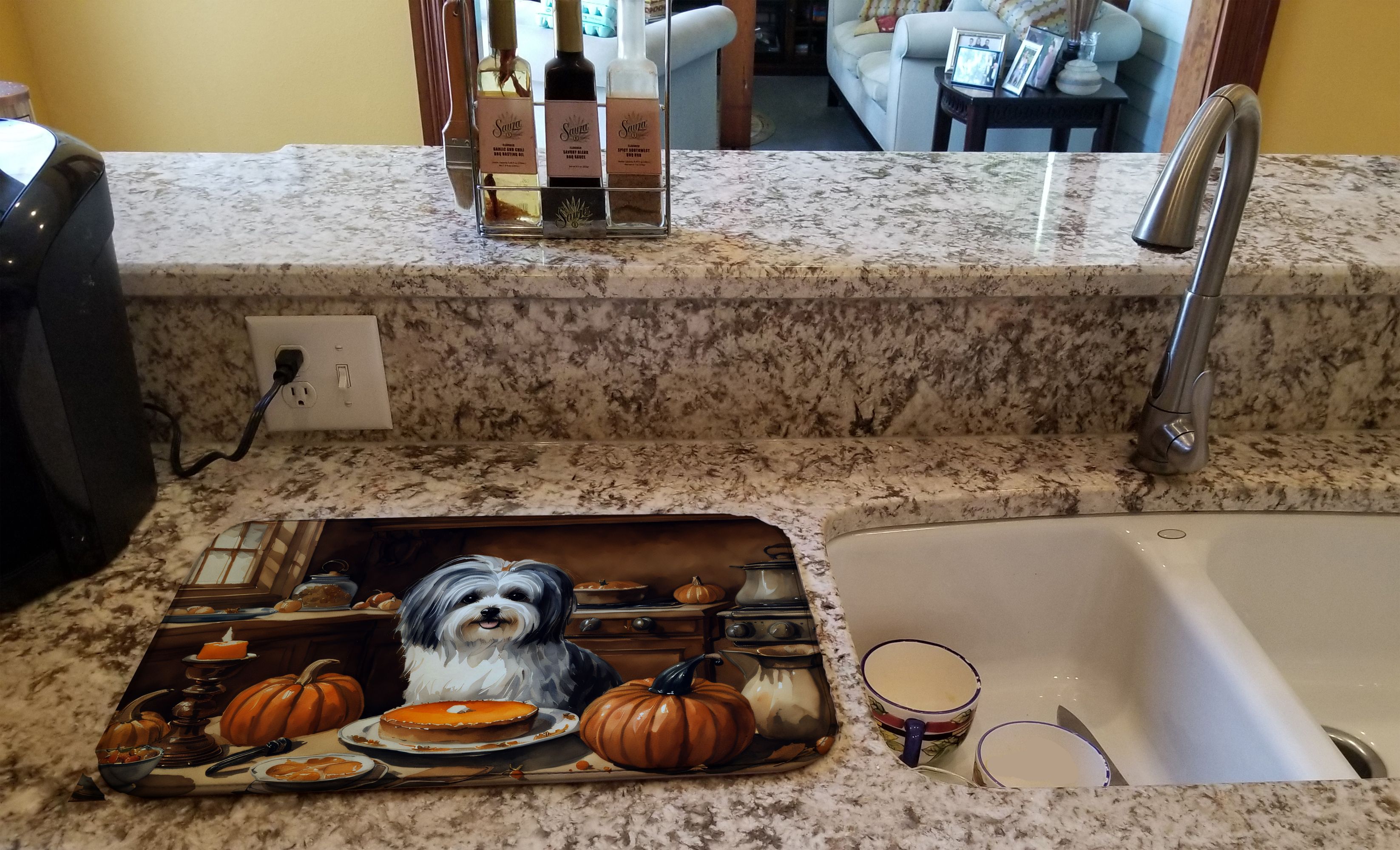 Dish Drying Mat featuring breed specific Havanese artwork. Celebrate Halloween with this Halloween Dish Drying Mat. Say goodbye to messy countertops and soggy dish towels with our innovative dish drying mat. Our high-quality dish drying pad is designed to keep your countertops dry while offering a stylish and efficient solution. Whether you're air drying dishes, glasses, stemware, silverware, pots, pans, bottles, or even fruits and vegetables, our dish mat is the perfect choice. The 14 inches x 22 inches size fits most counters and dish drying racks, and the non-slip design ensures stability. Made with water-absorbent polyester and a polyurethane foam insert, our dish drying mat is not only functional but also durable. It's machine washable and printed in the USA for long-lasting use. The beautiful artwork adds flair to your kitchen decor, making it a perfect housewarming gift or present for any occasion. Upgrade your kitchen experience with our absorbent and versatile dish drying mat.