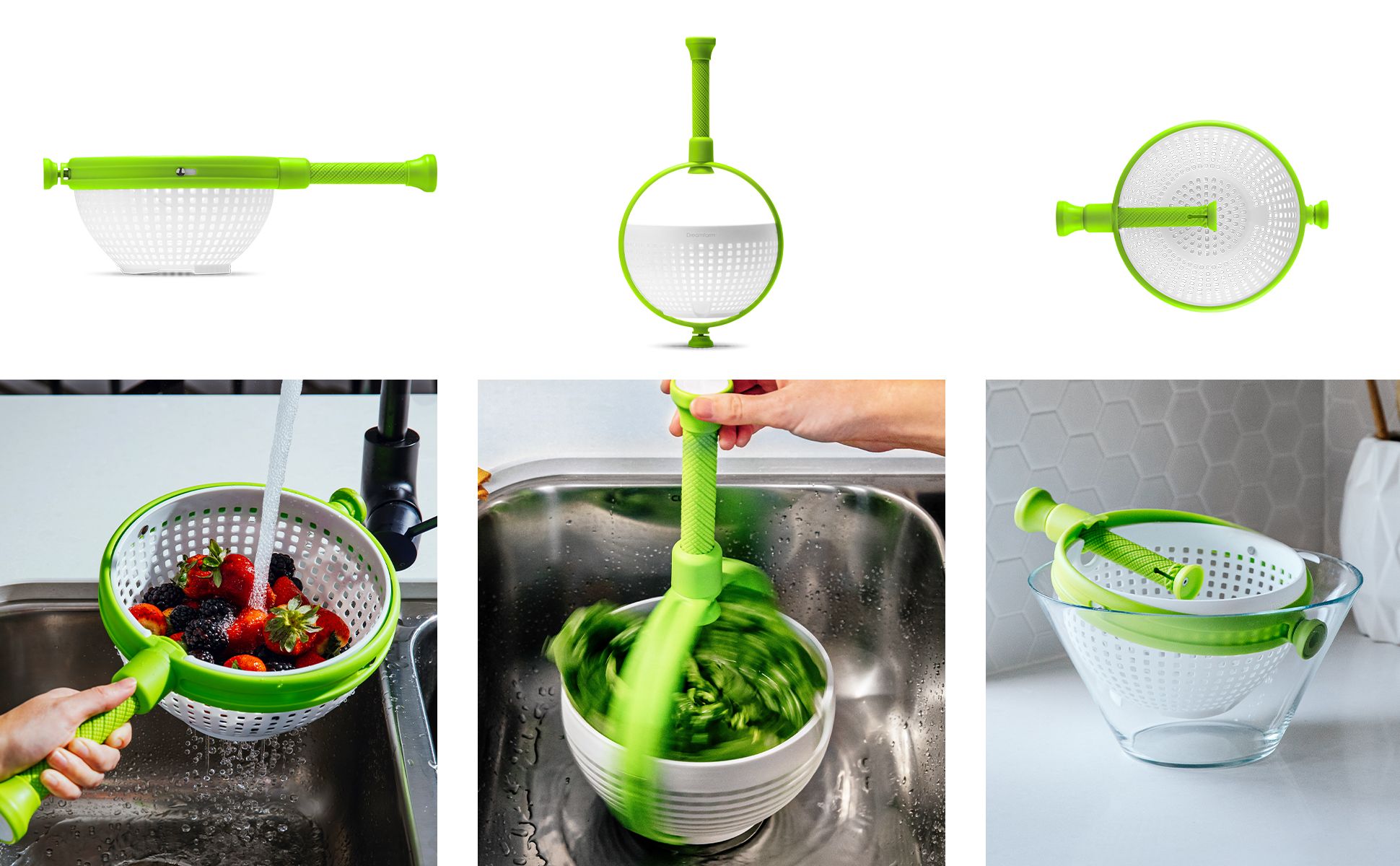 A COLANDER WITH A TWIST | Use to drain your pasta and rinse your veggies, or twist it into a spinner! No more shaking or drip-drying your salad leaves, the pump-action handle rotates the spinning colander, drying your produce in seconds.