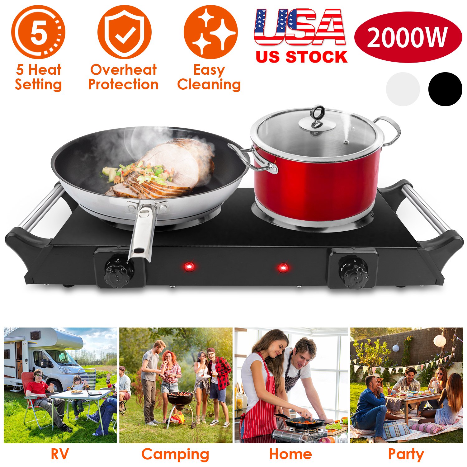 Home > 2000W Electric Dual Burner Portable Coil Heating Hot Plate Stove Countertop RV Hotplate with 5 Temperature Adjustments Portable Handles