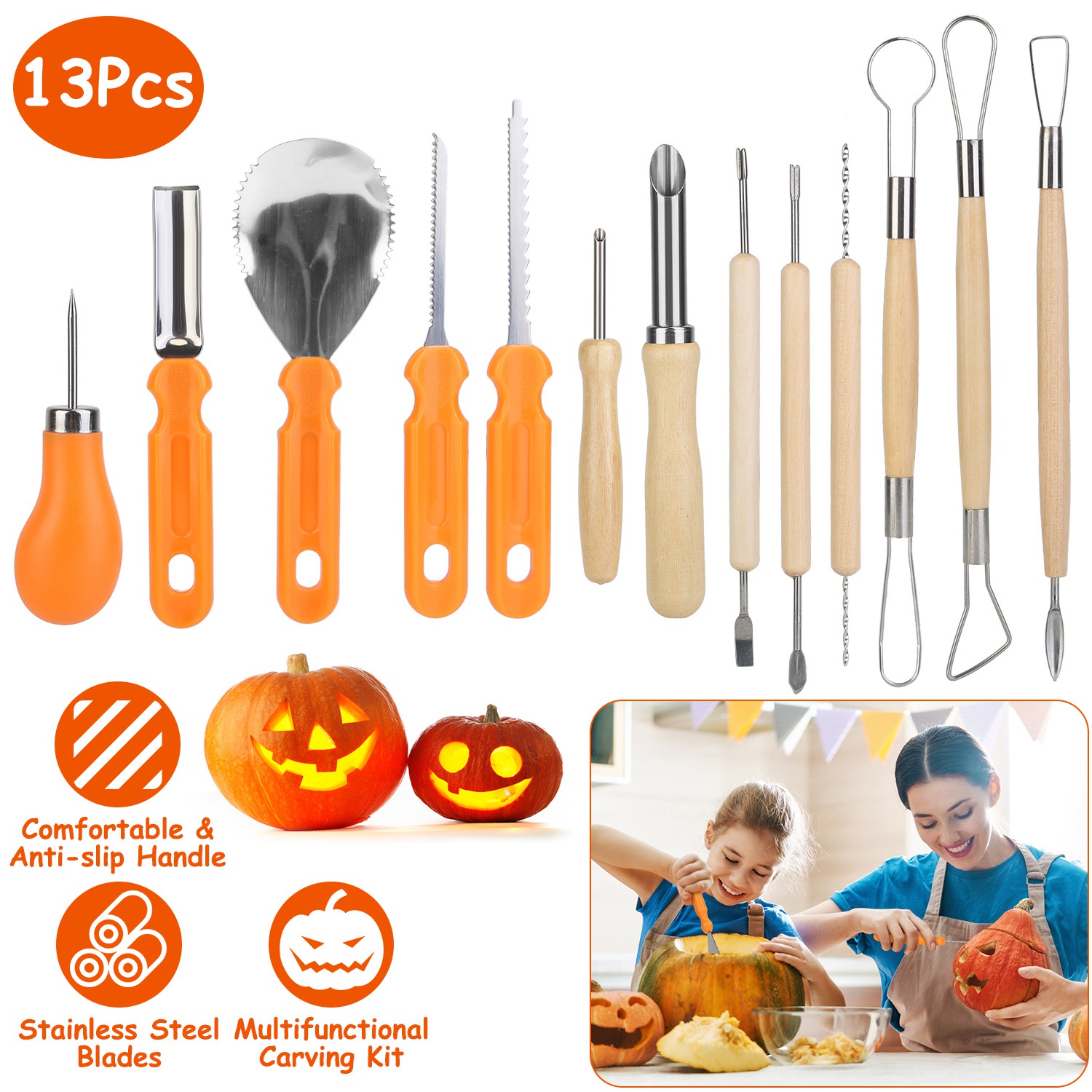 Home > 13Pcs Halloween Pumpkin Carving Kit Stainless Steel Carving Kit Pumpkin Sculpting Cutting Kit Halloween Decorative Tools
