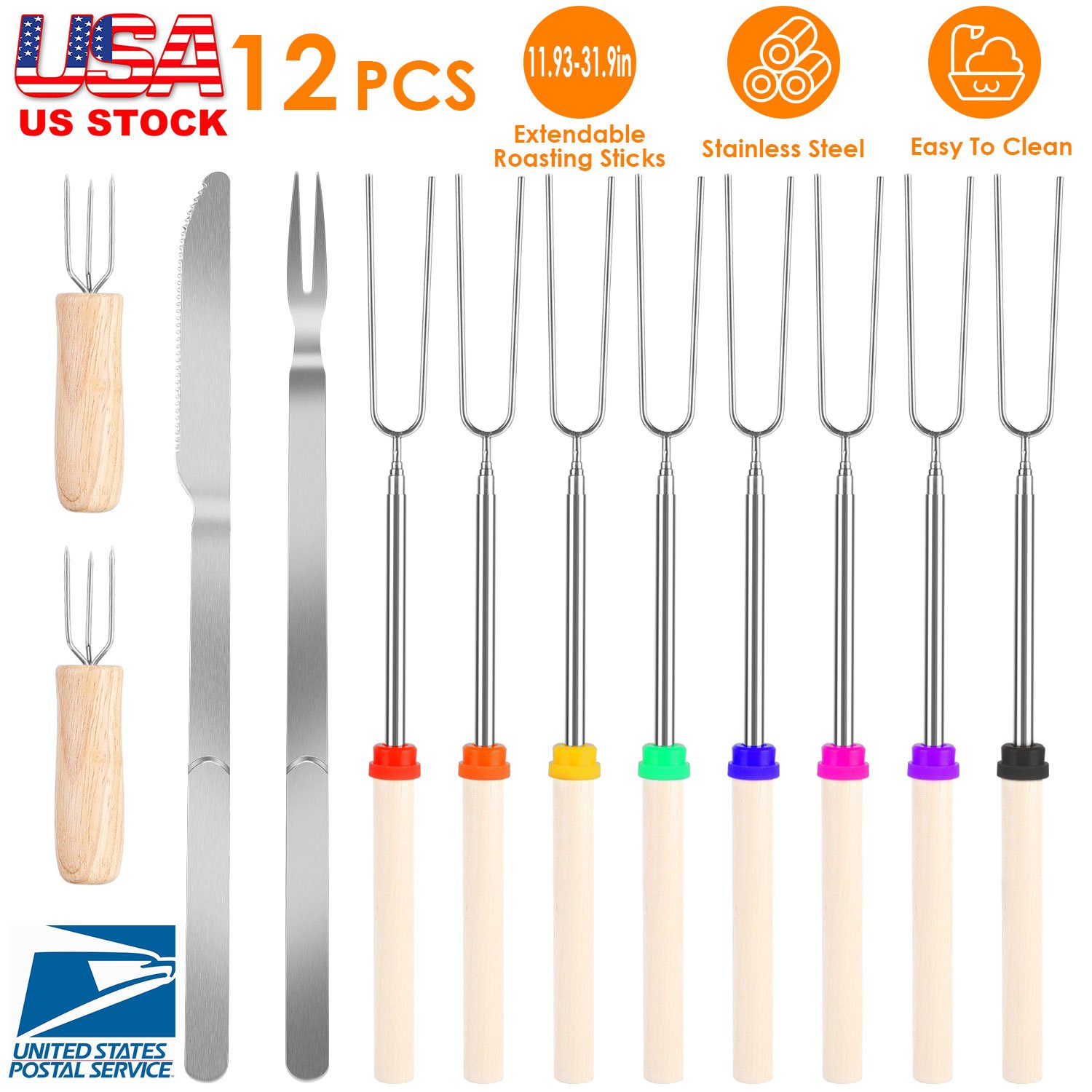 Home > Stainless Steel Roasting Sticks Set 31.9in Extendable Telescoping Marshmallow Hot Dog Fork Skewers Set w/ Corn Needles Fork Knife For BBQ Fire Pit Cam